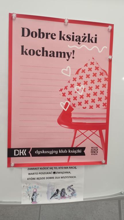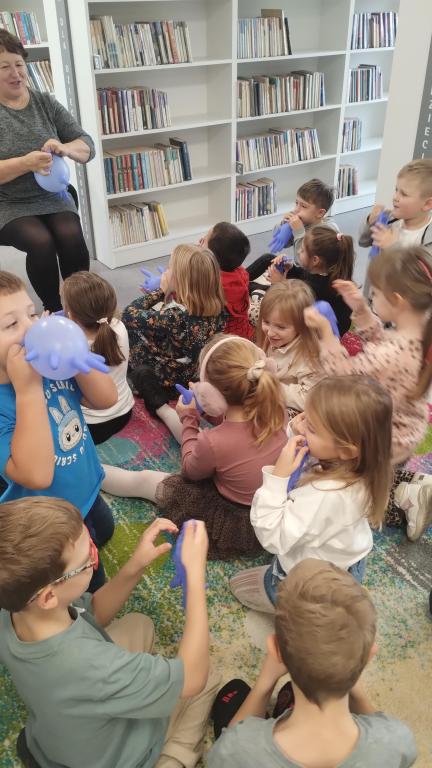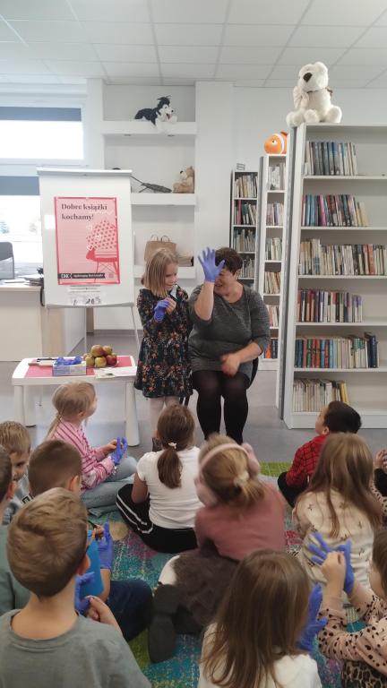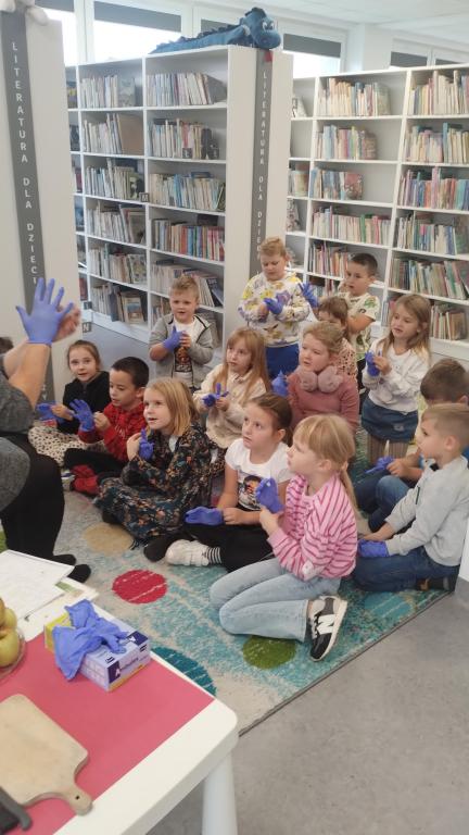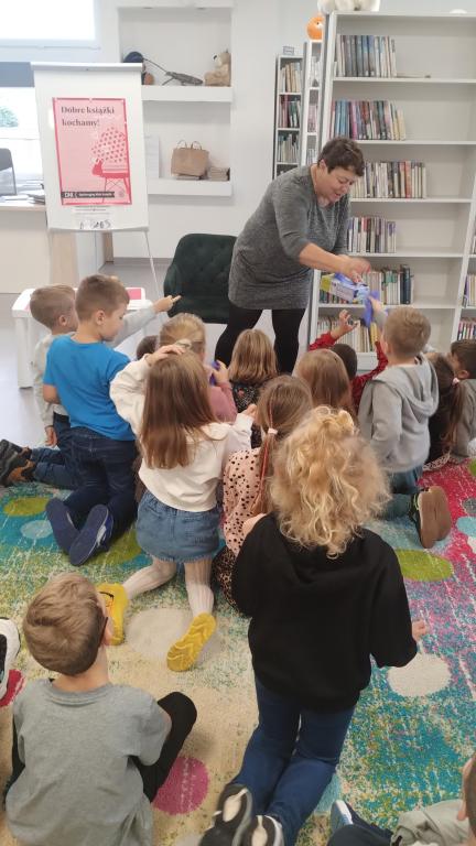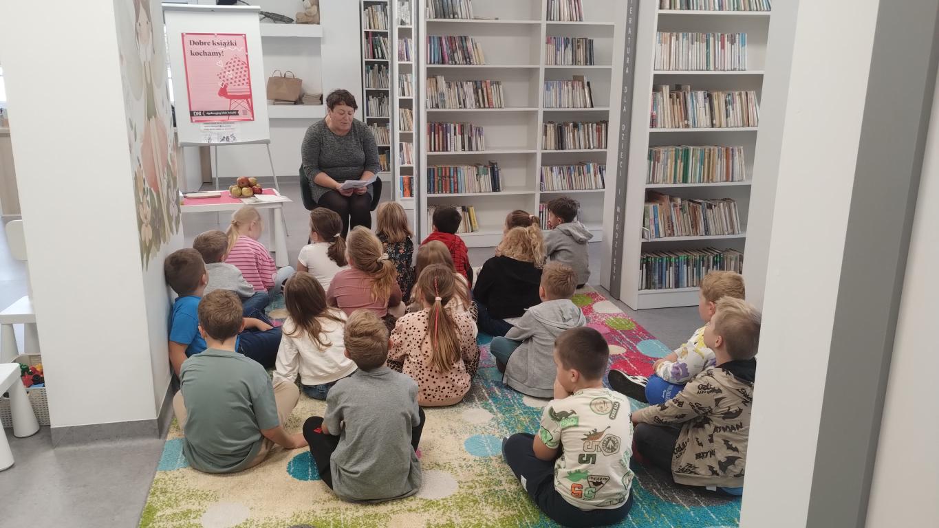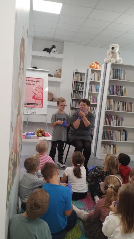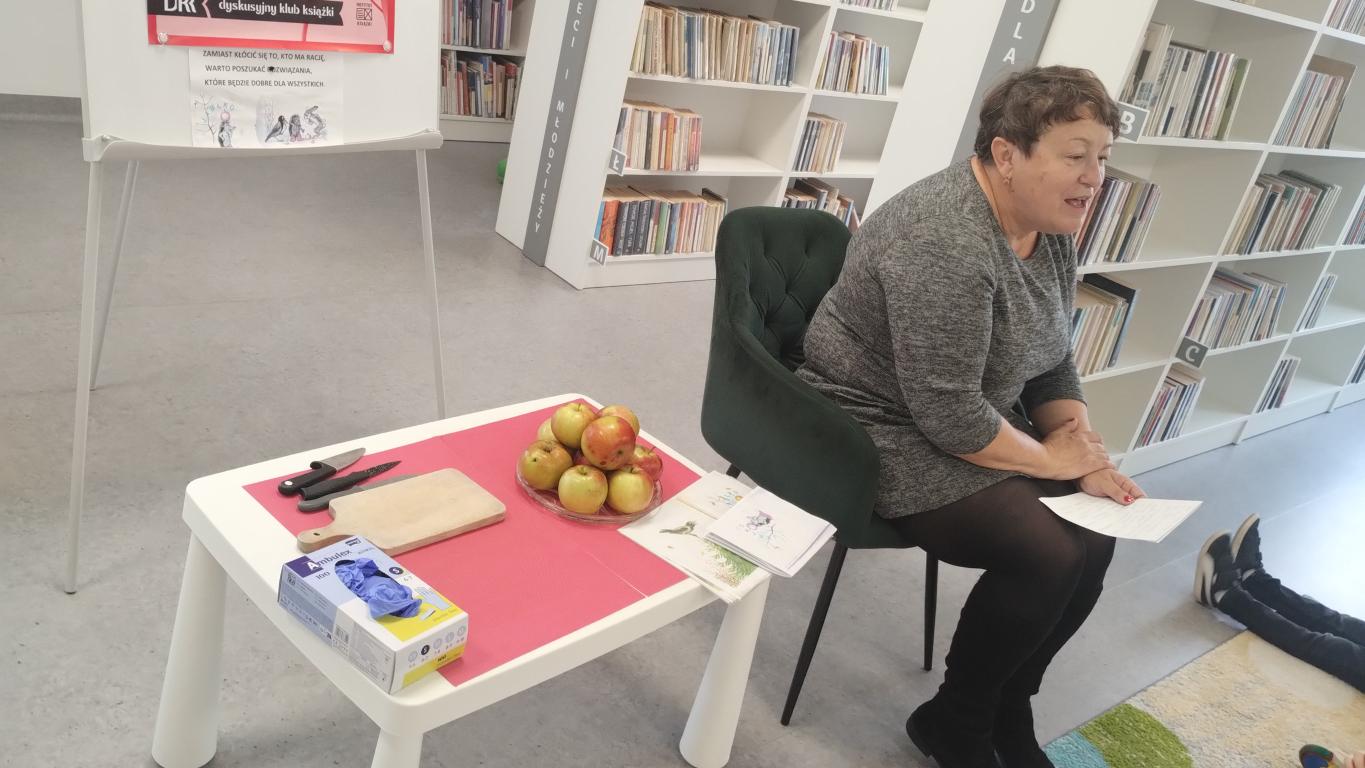 Podczas październikowego spotkania Dyskusyjnego Klubu Książki grupa – sześciolatki – wysłuchała opowiadania pt. "Jabłko", które przygotowała i przeczytała pani Marlena Barylska-Gałkowska. Dzieci brały udział w zabawach z rękawiczką, dzieliły się jabłkiem i wspólnie rozmawiały o współpracy i dzieleniu się. Spotkanie zakończyło się przesłaniem: „Zamiast kłócić się, dobrze jest znaleźć rozwiązanie, które będzie dobre dla wszystkich.”