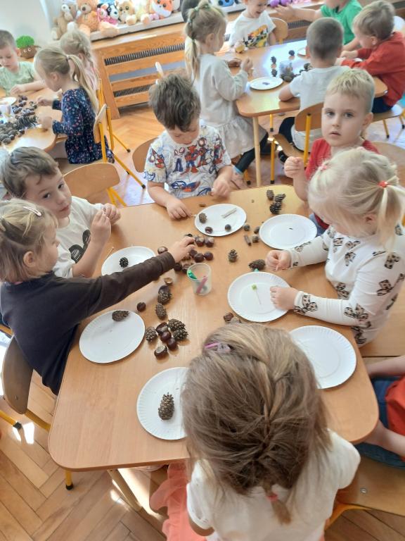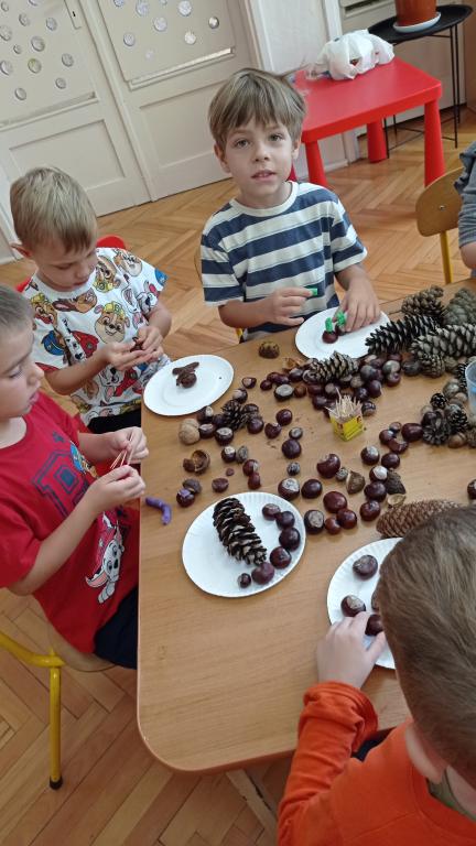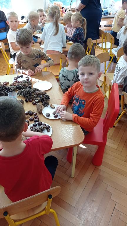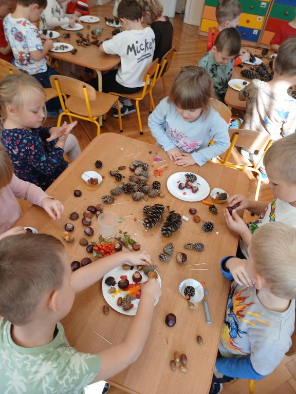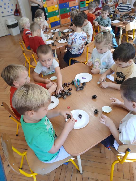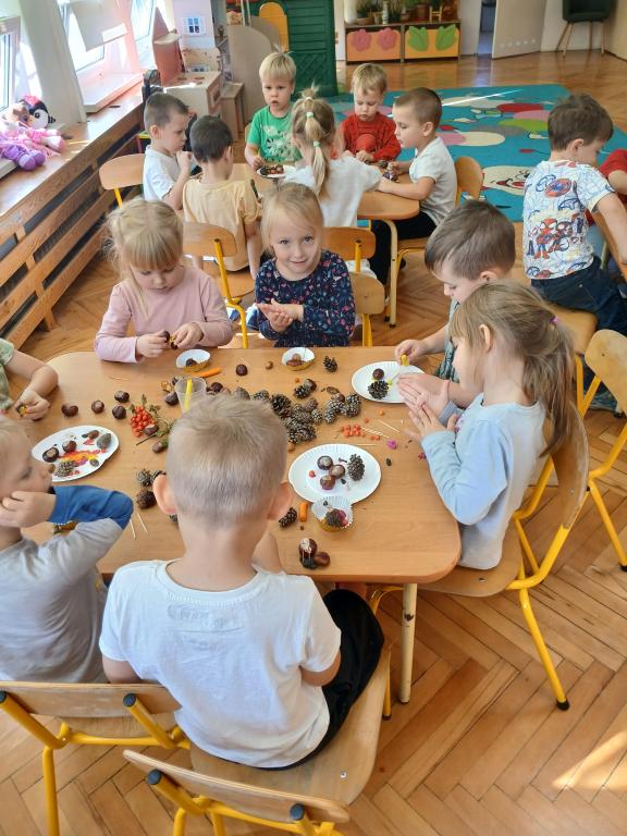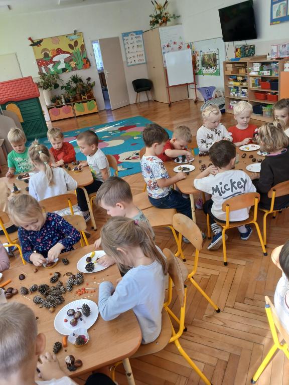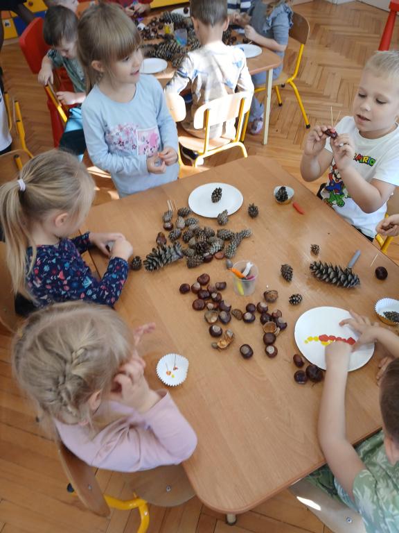 Korzystając z darów Pani Jesieni przedszkolaki z grupy 5-latki A i 4-latki postanowiły stworzyć śmieszne ludziki z kasztanów. Dzieci wykonując prace ćwiczyły zręczność manualną rączek a przy tym znakomicie się bawiły. W ten sposób dzieci udowadniają, że jesień wcale nie musi być smutna.