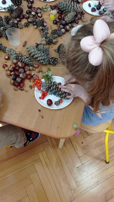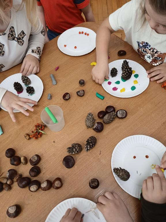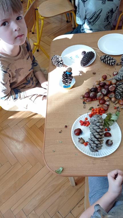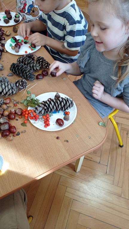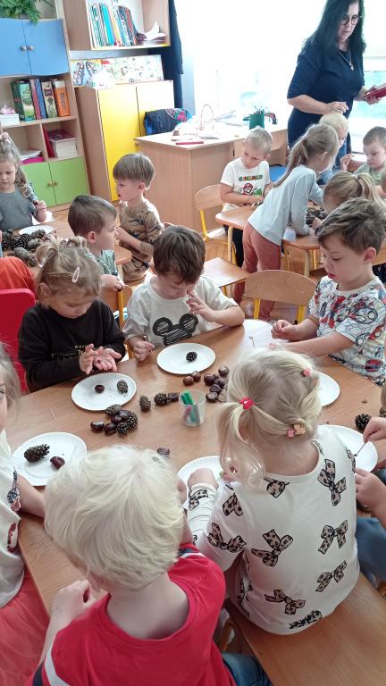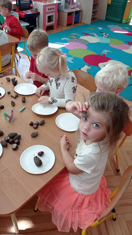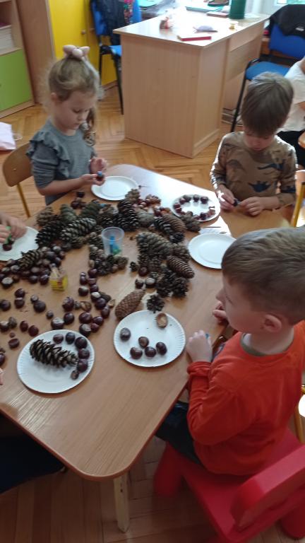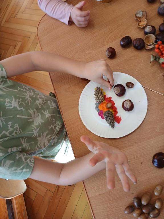 Korzystając z darów Pani Jesieni przedszkolaki z grupy 5-latki A i 4-latki postanowiły stworzyć śmieszne ludziki z kasztanów. Dzieci wykonując prace ćwiczyły zręczność manualną rączek a przy tym znakomicie się bawiły. W ten sposób dzieci udowadniają, że jesień wcale nie musi być smutna.