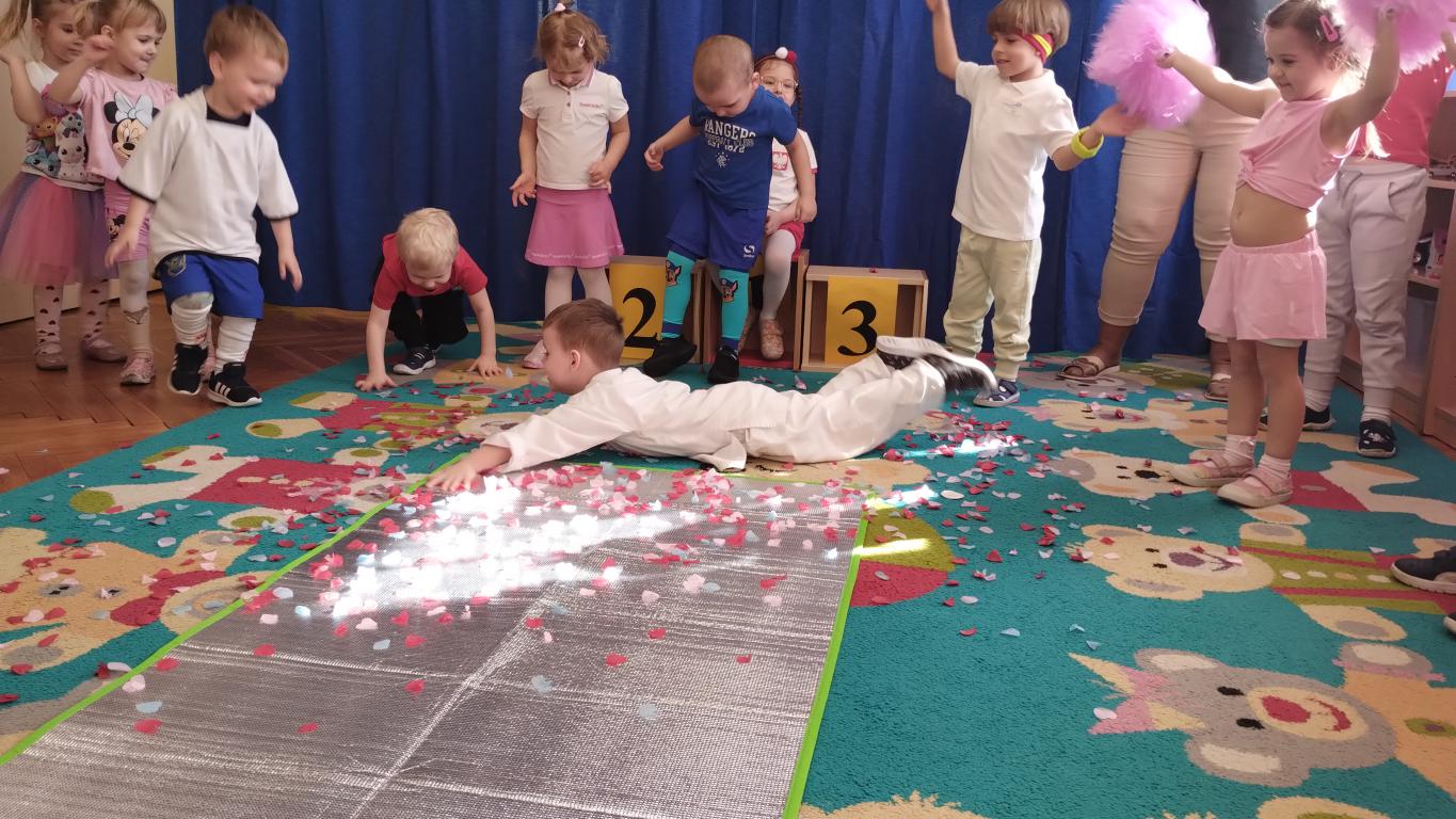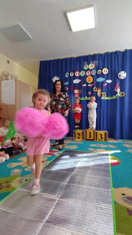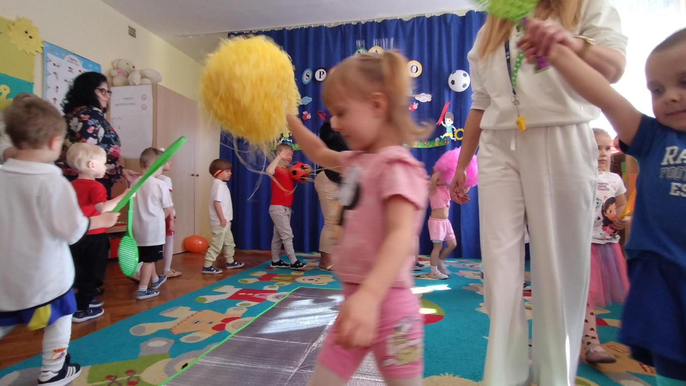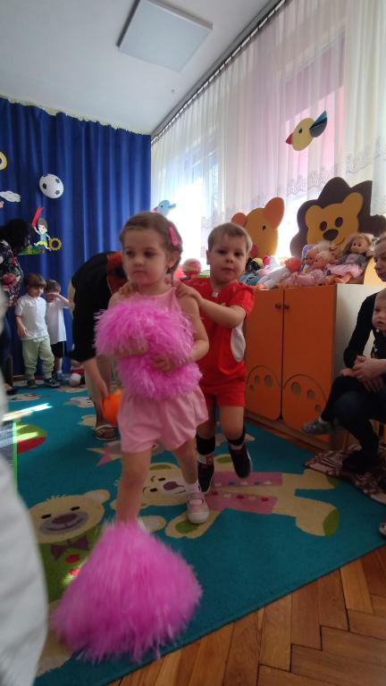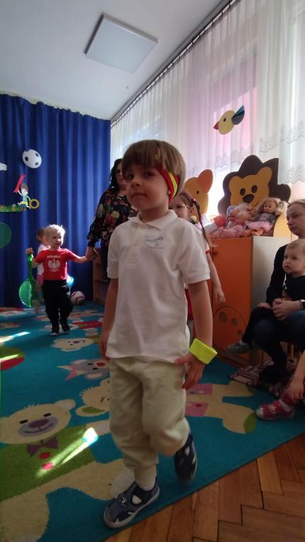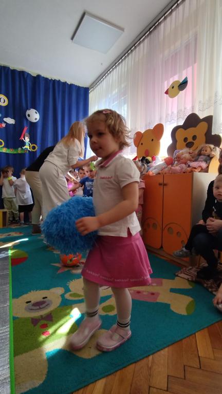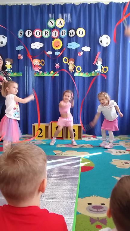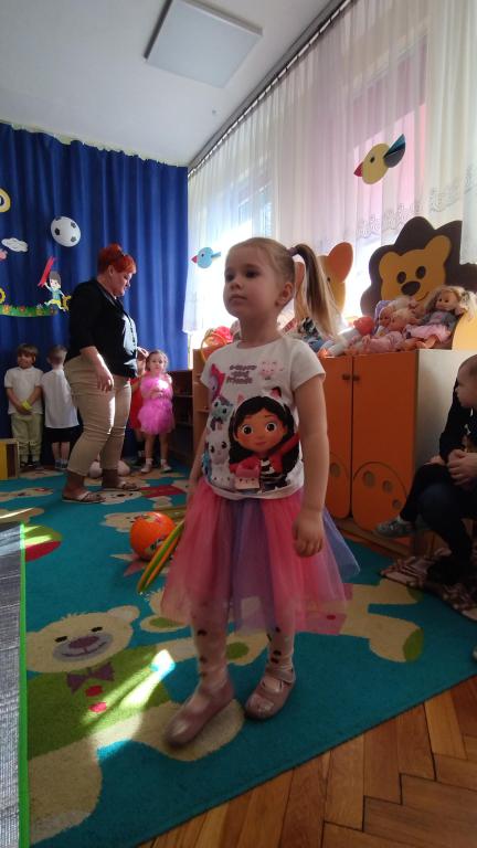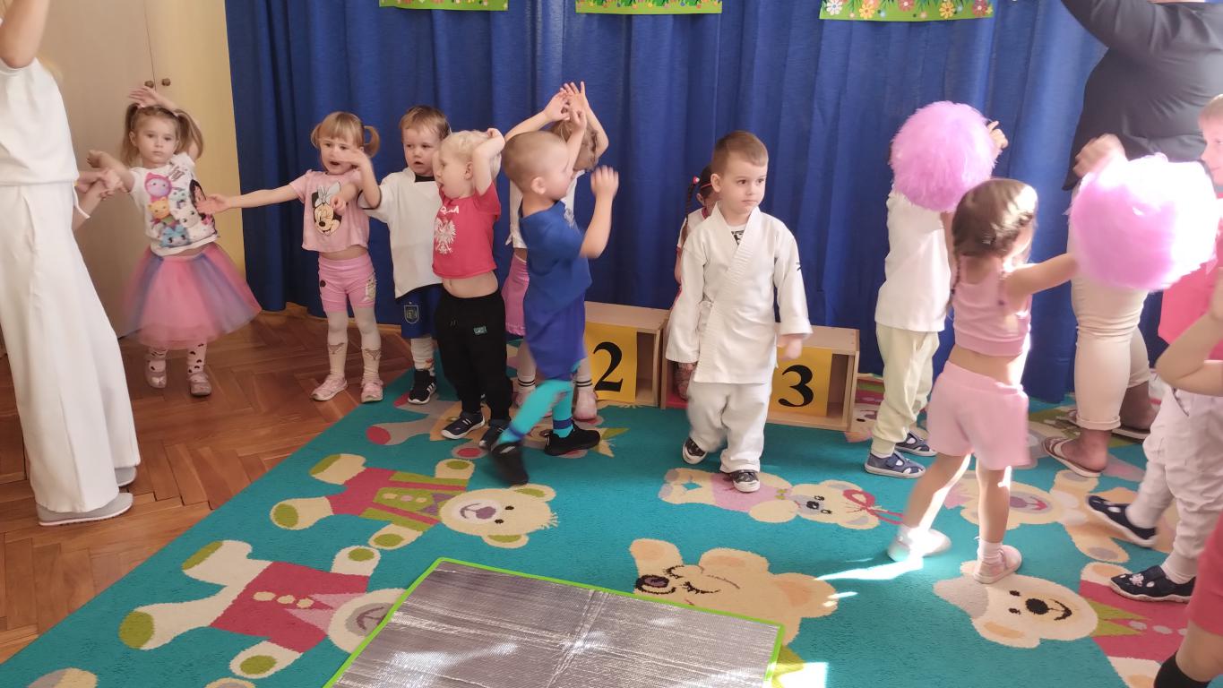 sobota, 22 marca 2025 roku Pokaz mody"Na sportowo" 2025 r. 3-latki 4-latki A Rozrywka Pierwszy Dzień Wiosny najmłodsze dzieci 3 i 4 latki uświetniły pokazem mody na sportowo. Dzieci pokazały się w pięknym tańcu ze wstążkami i piłkami. Wszystkie zaprezentowały stroje sportowe.