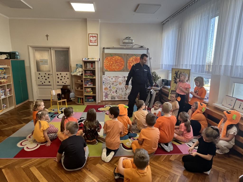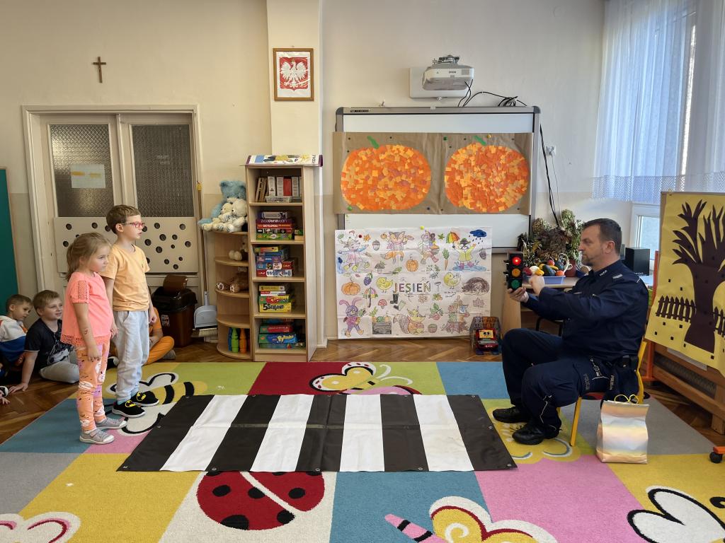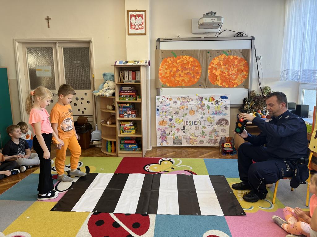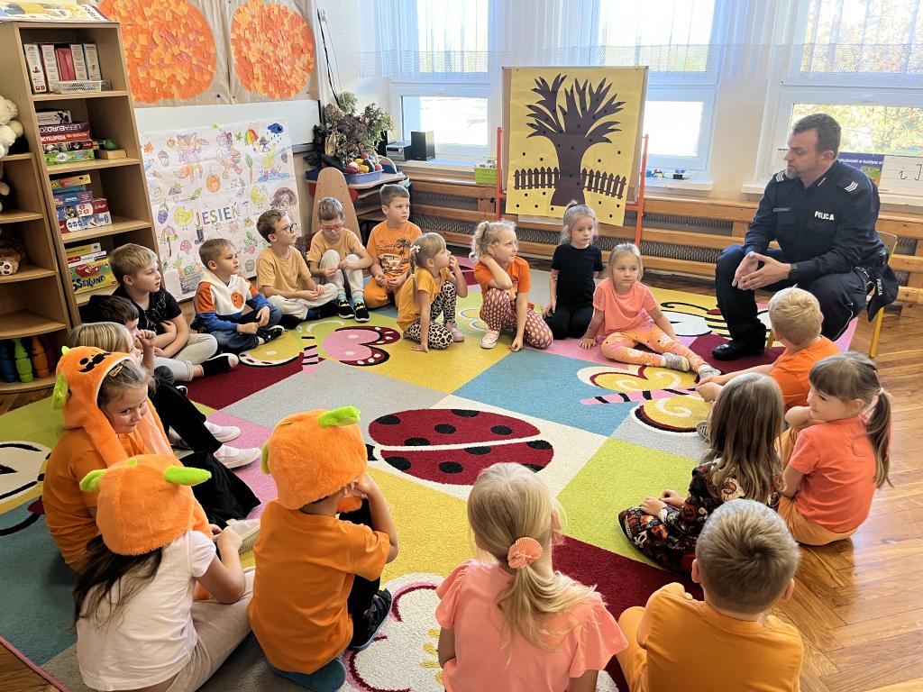 W naszym przedszkolu odbyło się wyjątkowe spotkanie z policjantem. Tematem spotkania było utrwalenie zasad ruchu drogowego oraz przypomnienie ważnych zagadnień dotyczących bezpieczeństwa dzieci – w przedszkolu, w domu i poza nim.
