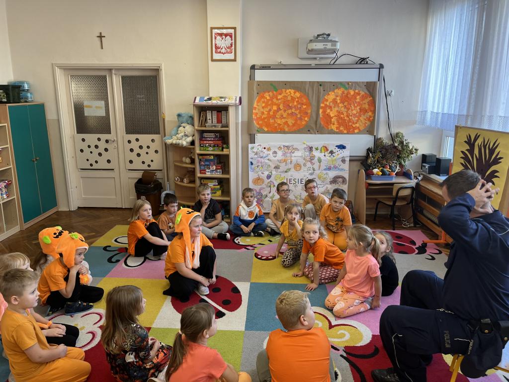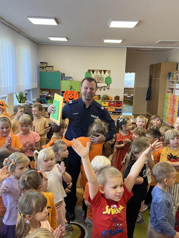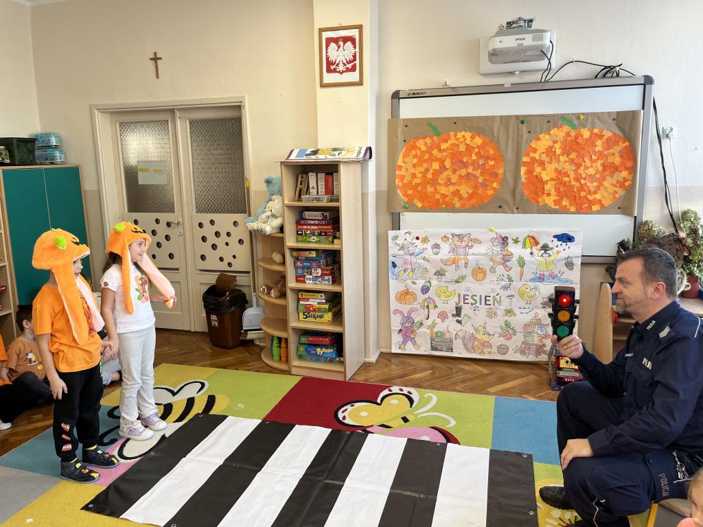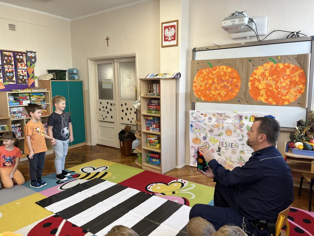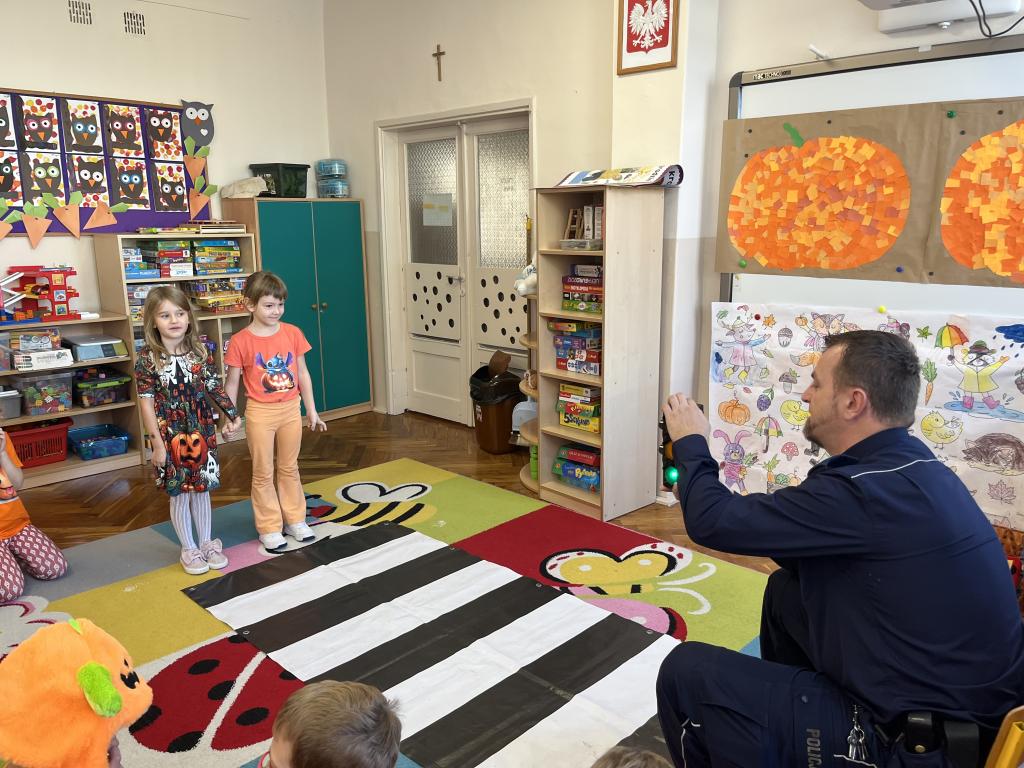 W naszym przedszkolu odbyło się wyjątkowe spotkanie z policjantem. Tematem spotkania było utrwalenie zasad ruchu drogowego oraz przypomnienie ważnych zagadnień dotyczących bezpieczeństwa dzieci – w przedszkolu, w domu i poza nim.