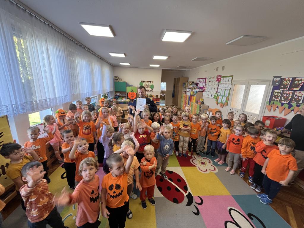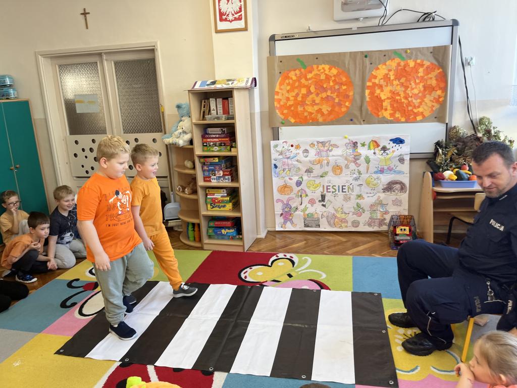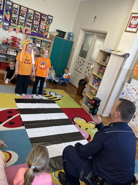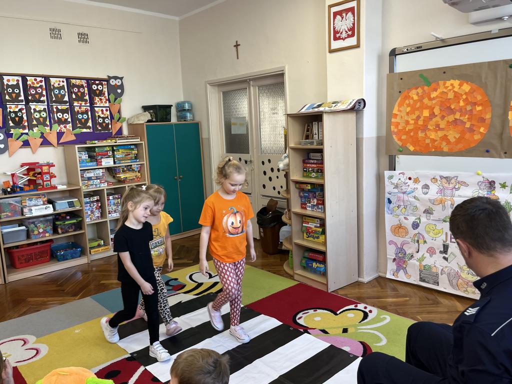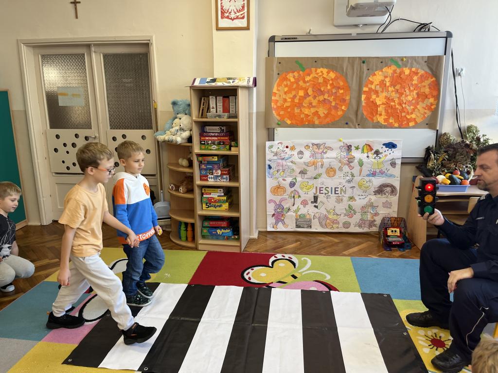 Dzieci utrwaliły podstawowe zasady bezpiecznego przechodzenia przez jezdnię, a także rozmawiały o właściwym zachowaniu w kontaktach z nieznajomymi. Podczas pogadanki dowiedziały się również, jak reagować w sytuacjach zagrożenia, kiedy należy poprosić o pomoc oraz jakie numery alarmowe trzeba znać i wybierać w razie potrzeby.