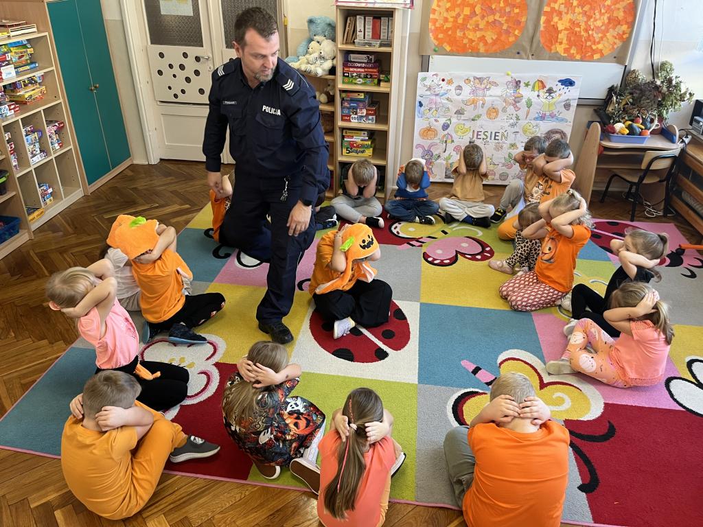 Pan policjant zademonstrował dzieciom, jaką postawę należy przyjąć podczas ataku psa – była to bardzo cenna i praktyczna lekcja. Przedszkolaki z dużym zainteresowaniem słuchały rad i wskazówek naszego gościa.