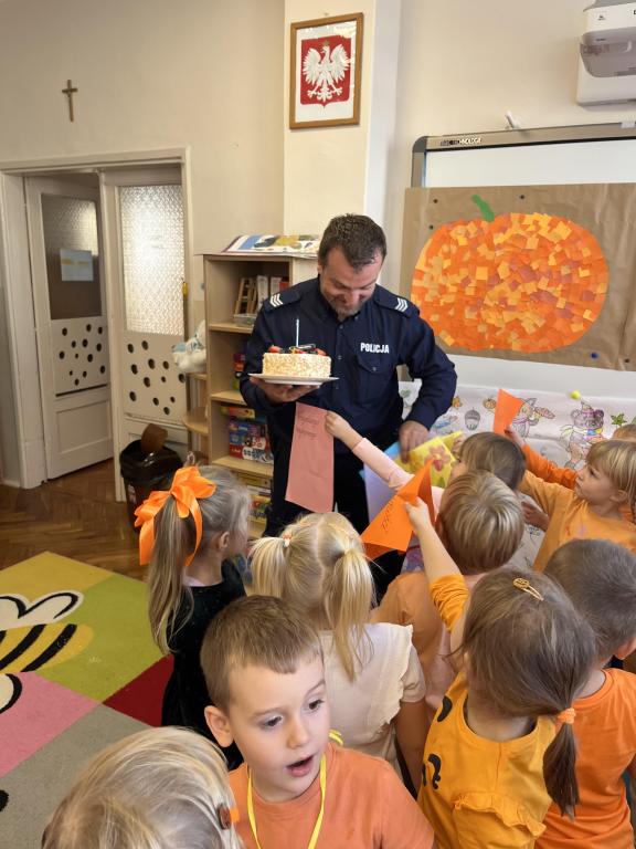 Na zakończenie dzieci wręczyły panu policjantowi własnoręcznie wykonane laurki jako wyraz podziękowania. Ten dzień był szczególnie wyjątkowy – nasz gość obchodził swoje urodziny! Dzieci zaśpiewały głośne „Sto lat” i wręczyły tort urodzinowy.