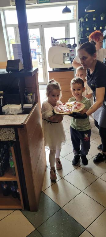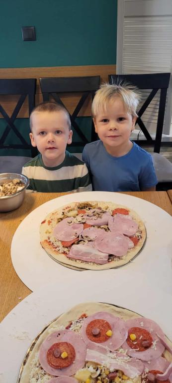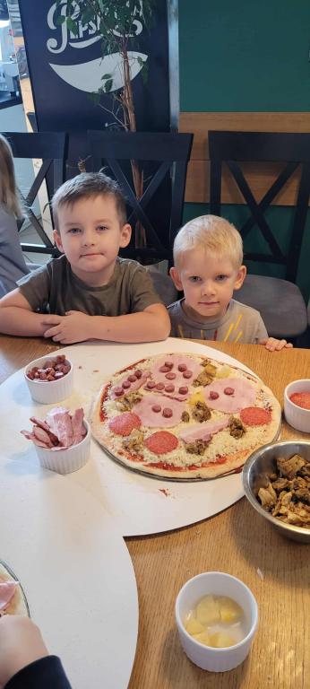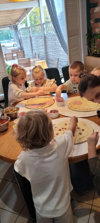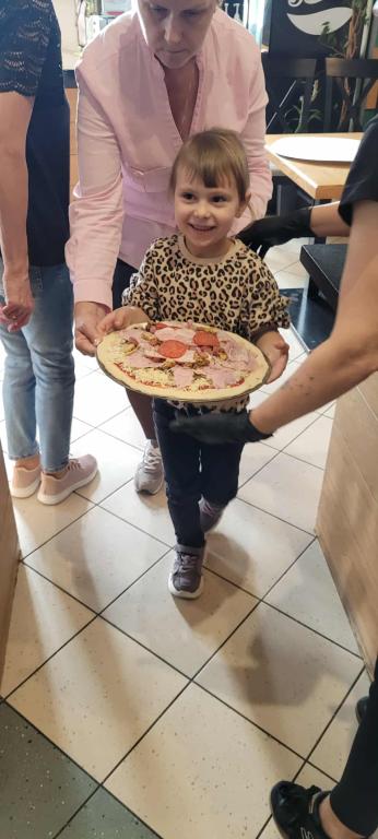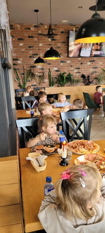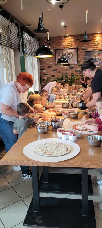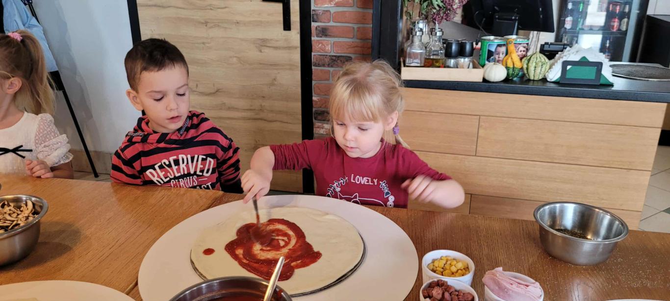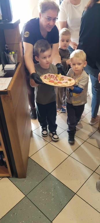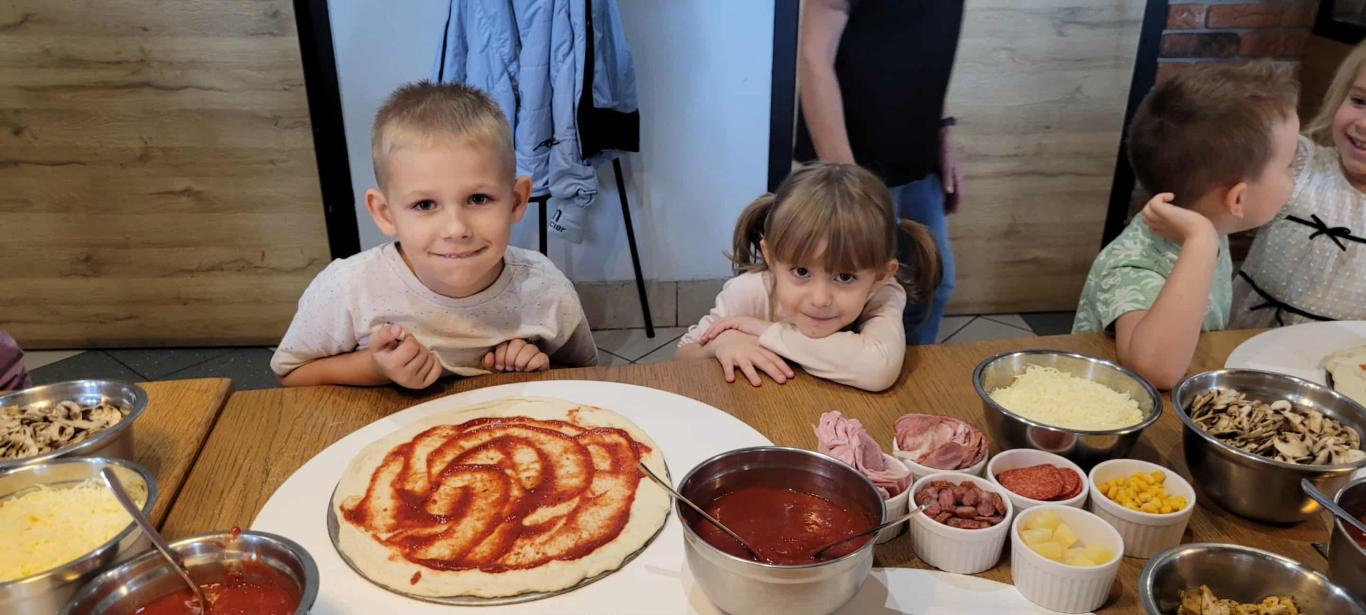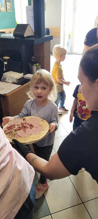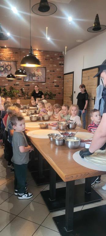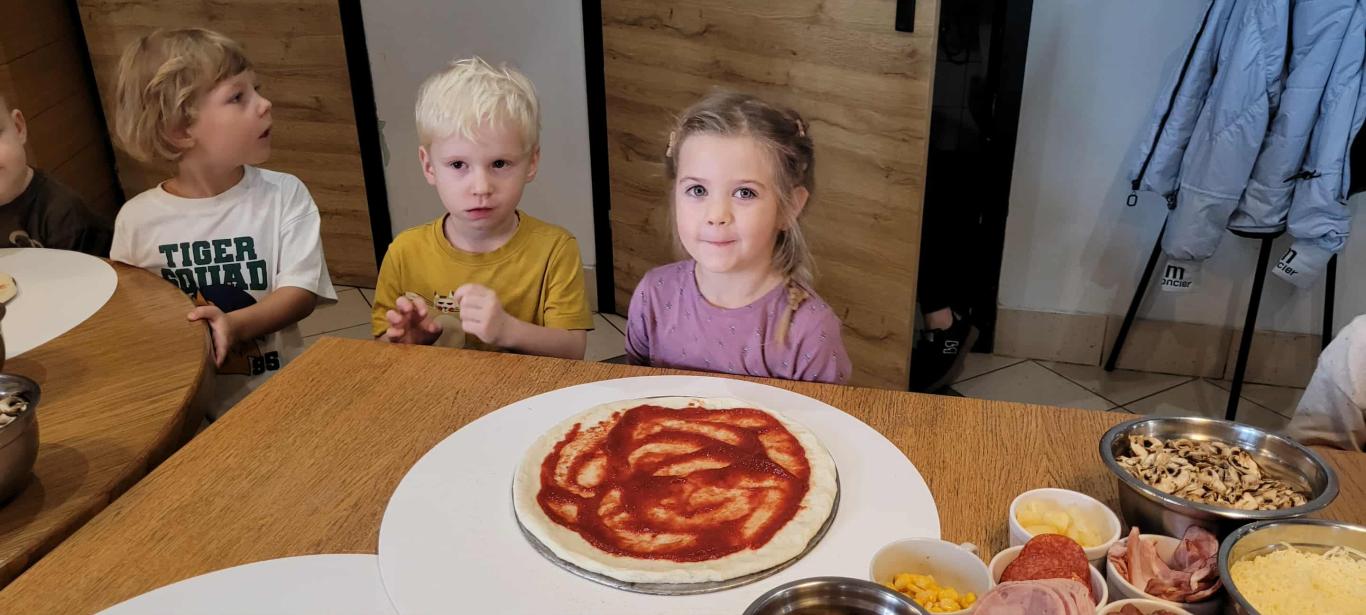 15.10.2025r., w jesienne przedpołudnie grupa 4-latków podjęła wyzwanie, aby przeżyć kulinarna przygodę. Celem wyprawy była pizzeria. Dzieci samodzielnie, ale pod okiem osób tam pracujących przygotowały pizzę. W czasie pracy na buziach dzieci malował się uśmiech, samodzielne dekorowanie ciasta różnymi dodatkami do dla nich ogromna frajda. Każda wykonana pizza była bardzo kolorowa i smaczna. Nagrodą za wykonaną pracę było skosztowanie pizzy oraz dyplomy "Małego Kucharza". Dzieci do przedszkola wróciły radosne i zadowolone.
